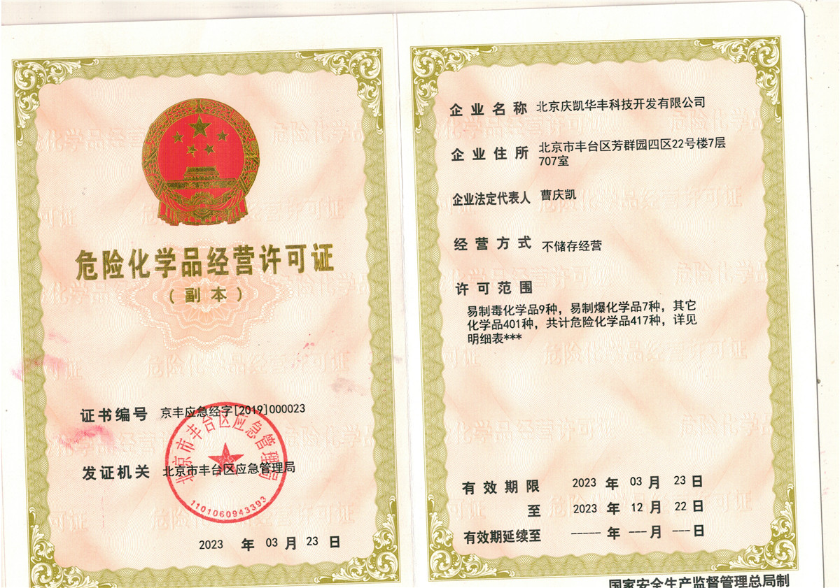 本公司具备危险化学品经营许可证、非药品类易制毒化学品经营备案等资质证明。公司所有员工都经过北京市安监局专业培训并通过专业考试,取得安监局颁发的资格证书。