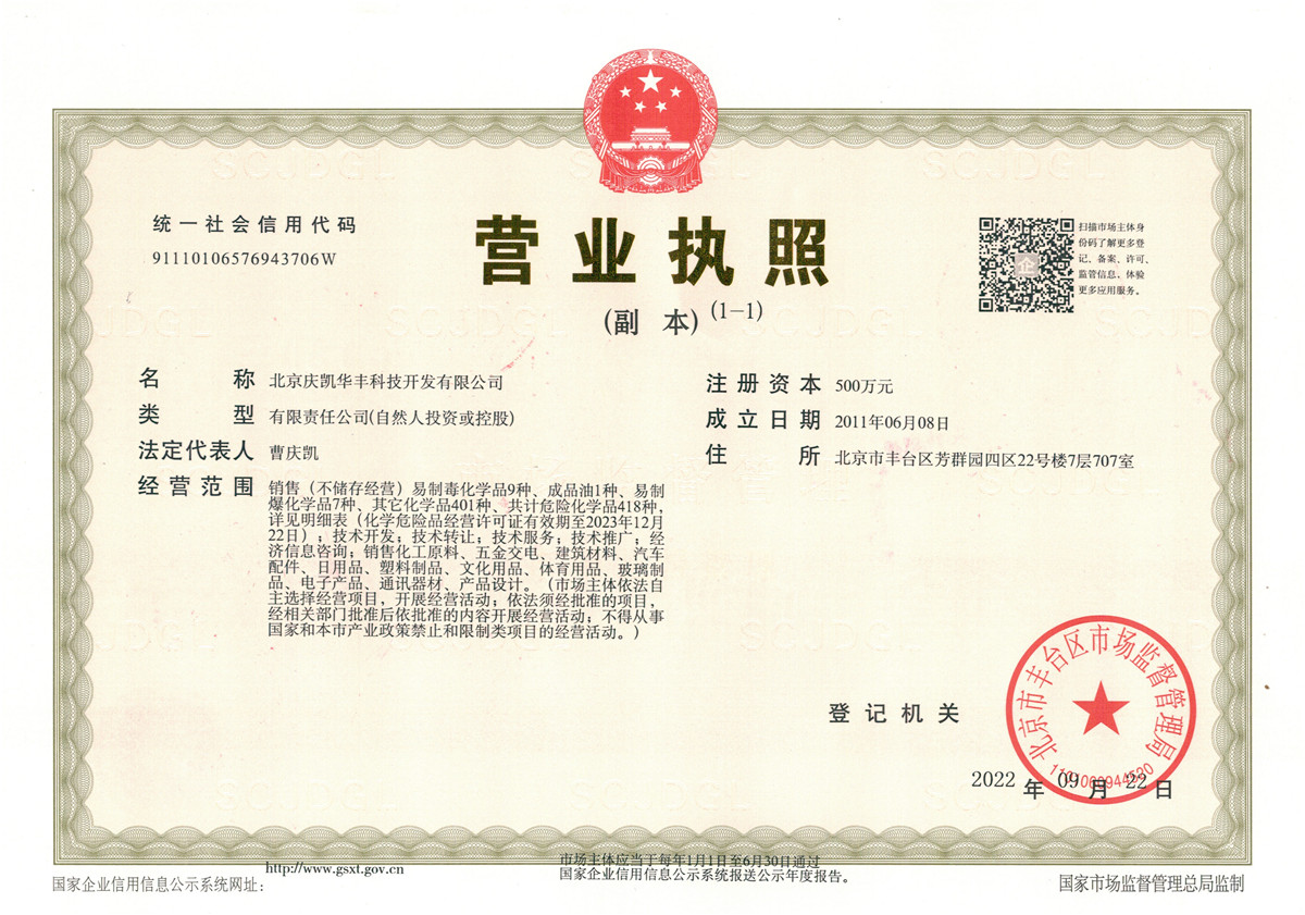 我公司成立于1993年,由原来国有企业(北京有朋精细化工经营公司)隶属于北京民族事务委员会,经改制成为现在的北京庆凯华丰科技开发有限公司。公司注册资金500万元,经营通用试剂、分析试剂、基准试剂、生化试剂、进口试剂、进口耗材、标准物质、化工原料、玻璃仪器、科学仪器等十几大类,数万个规格品种的商品。